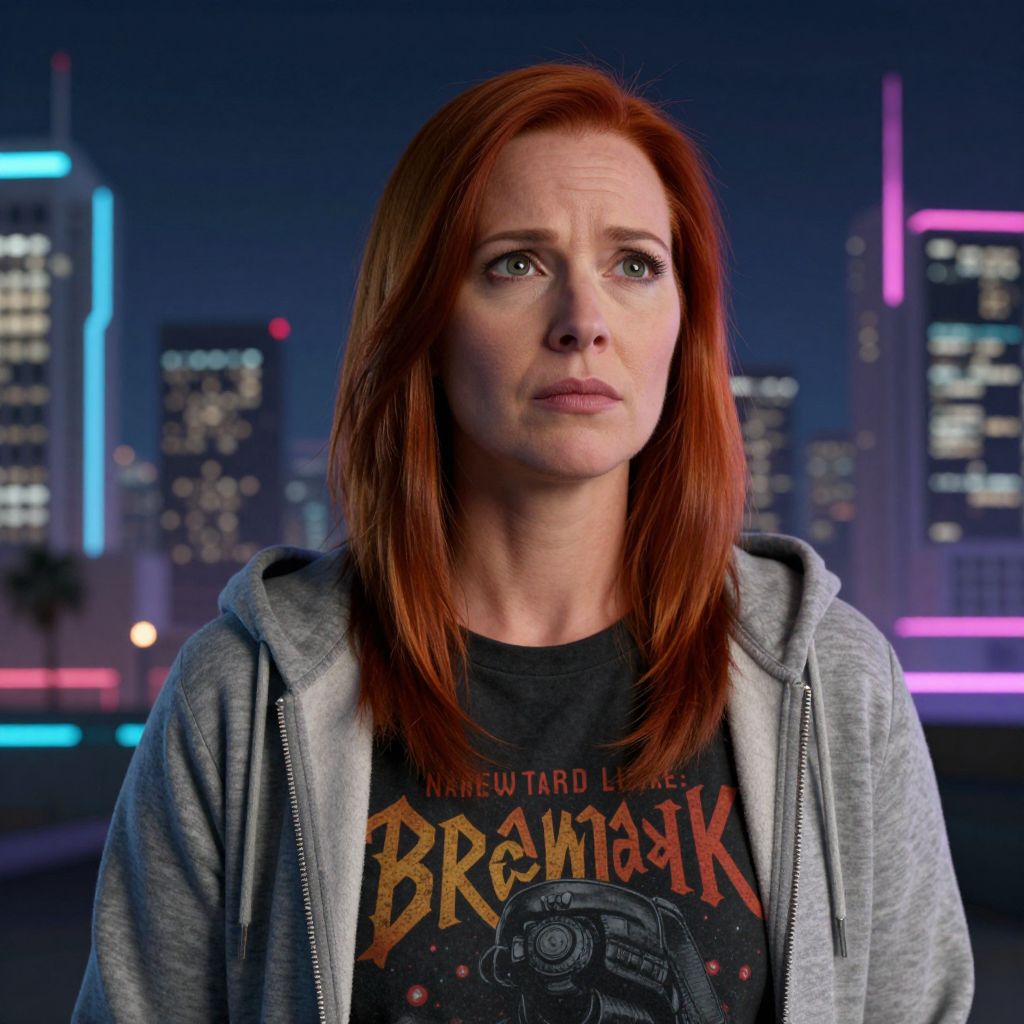 Photograph of a Caucasian woman with straight, shoulder-length red hair, wearing a black graphic T-shirt with "Bram Stoker" text and a camera graphic, and a gray hoodie. She has fair skin, light blue eyes, and a slightly worried expression. The background features a nighttime cityscape with blurred, colorful neon lights from skyscrapers, creating a vibrant urban atmosphere. The image has a cinematic quality with sharp focus on the woman and a softly blurred background. The lighting highlights her facial features and hair, adding depth and contrast to the scene.