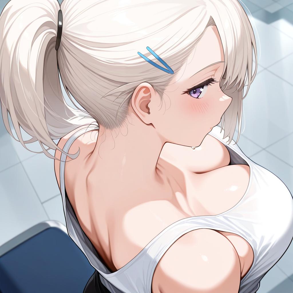 1girl, asymmetrical cut, brown eyes, platinum, hair ornament, ponytail, hairclip, airport, large breasts, downblouse from behind, downblouse, from behind, tank top , white tank top, cleavage, from above, nape, head down, looking at viewer, looking back, looking up, sideways glance