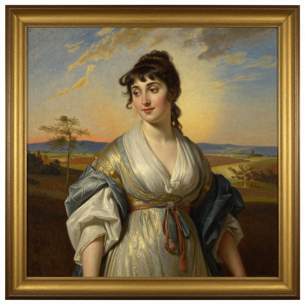 Neoclassical portrait of a pale-skinned woman with dark curly hair, wearing a silver and blue embroidered dress, set against a sunset landscape.