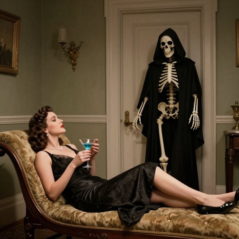 Room with a door. 1940s diva laying on a chaise longue having a martini. death skeleton wearing a hooded cape and black robe enters the room through the door