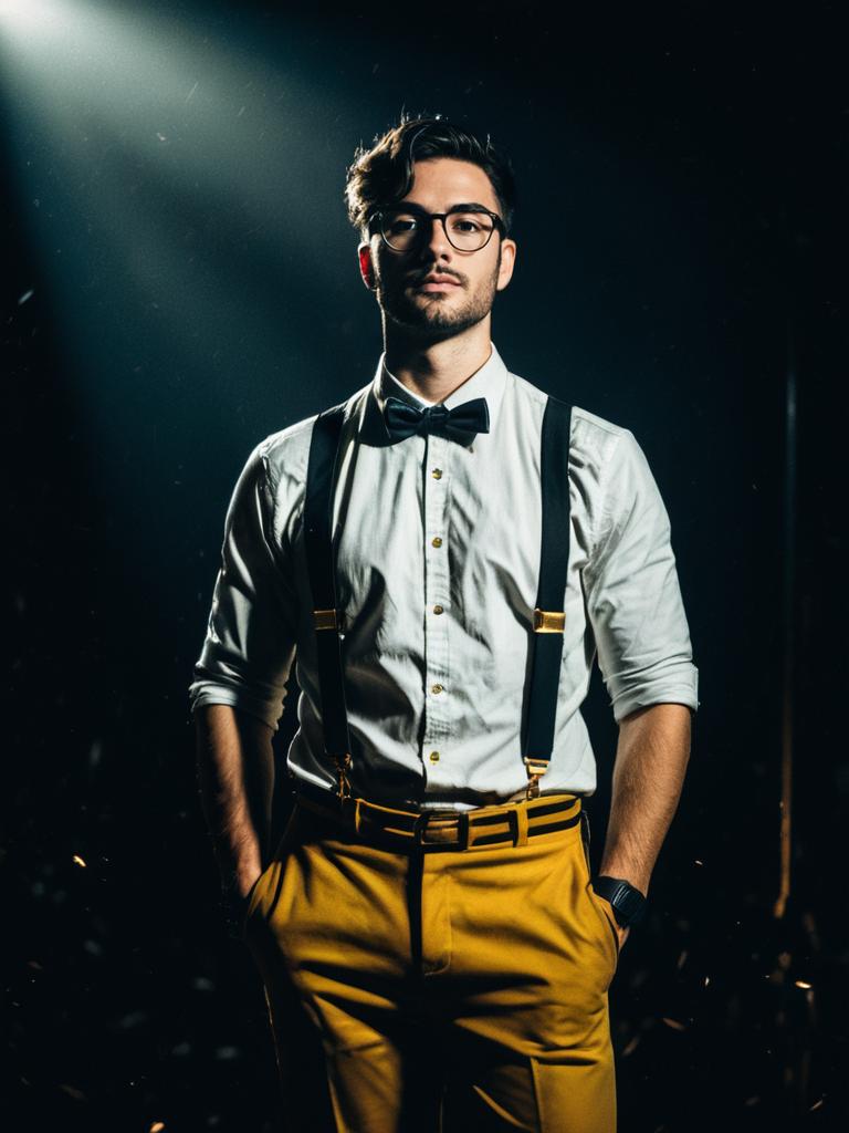 Man in Nerd Costume, full-body cosplay photo with glasses and suspenders --sref 1387