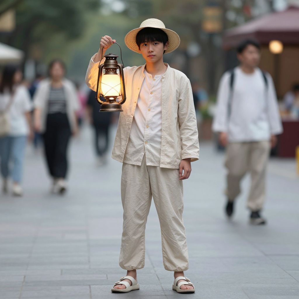 Other costume, 1boy, male focus, solo, hat, lantern, outdoors, standing, blurry, looking at viewer, full body, blurry background, black hair, sandals