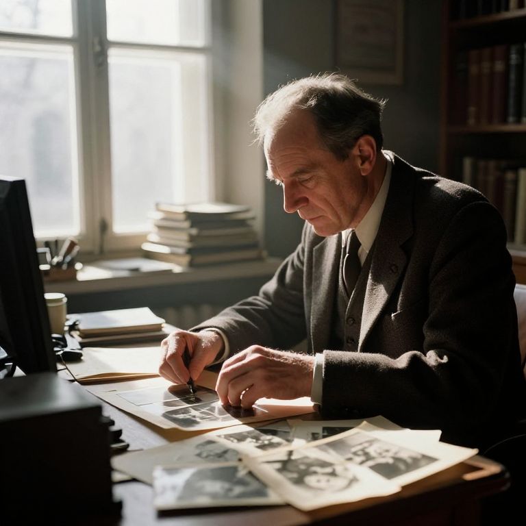 Joseph Schindler portrayed as an archivist uncovering hidden stories through old photographs and relics, cluttered office environment, beams of sunlight breaking through dusty windows, photorealistic style with emotional depth