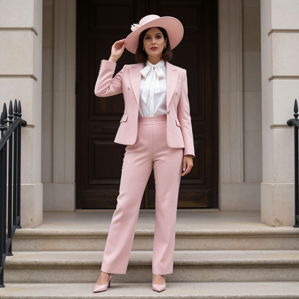 Photograph of a confident woman standing on stone steps in front of a dark wooden door. She is wearing a light pink, tailored suit with a white blouse and matching pink high-heeled shoes. Her wide-brimmed pink hat, adorned with a white flower, complements her outfit. She has dark hair and is lightly tanned. Her right hand adjusts the hat, while her left hand rests by her side. The background features stone walls with black iron railings on the left. The overall style is elegant and sophisticated.