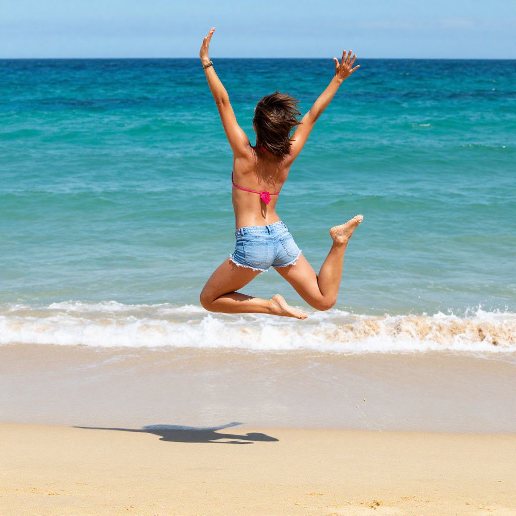 Woman joyfully leaping on sandy beach, arms raised high against vibrant turquoise ocean backdrop, her shadow cast sharply on golden sand beneath her.
