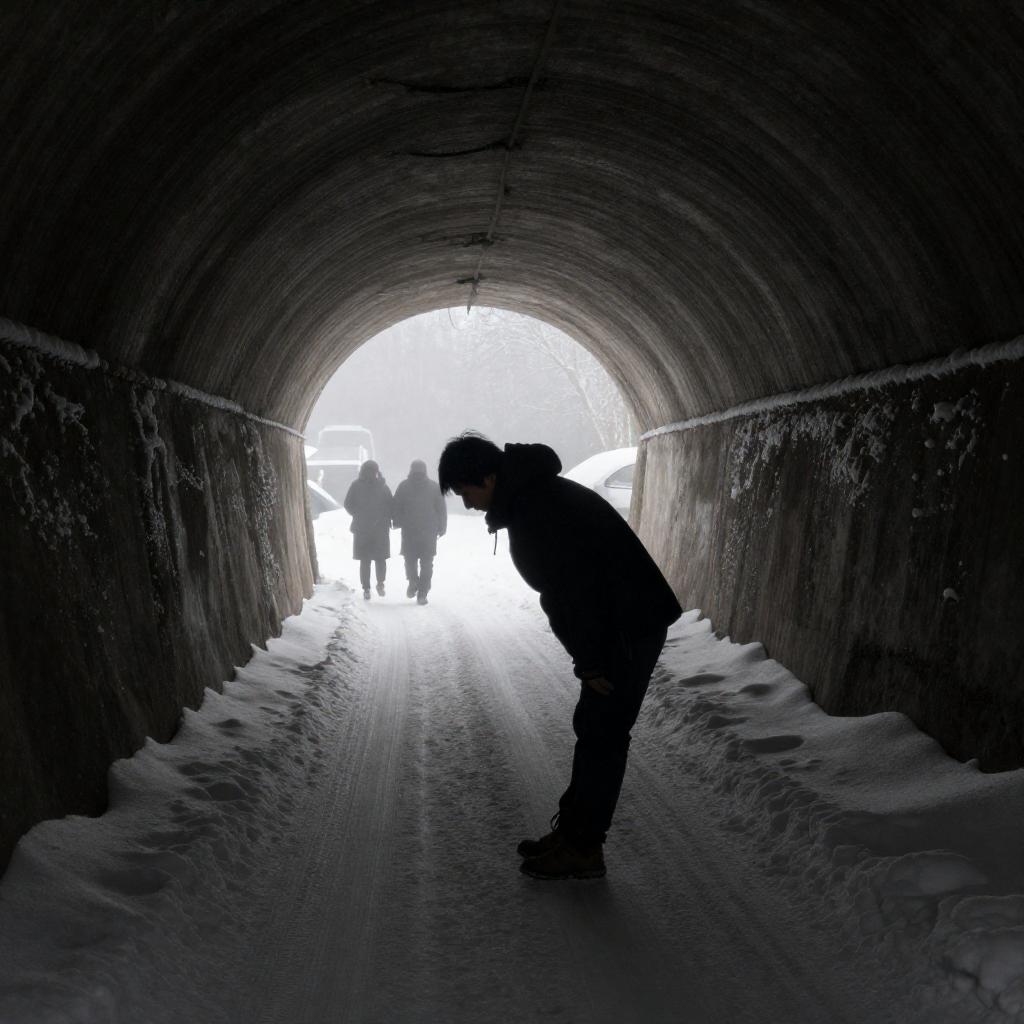 Silhouetted person with curly hair walking down a snow-covered, narrow tunnel. Dim light at the end. Dark, ured walls on both sides. Shadows and snow create a mysterious atmosphere. Person in dark clothing, arms slightly raised.