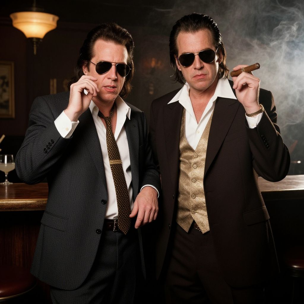 Photograph of two men in a dimly lit bar. Both wear black suits, white shirts, and dark sunglasses. The man on the left has dark, slicked-back hair and holds a phone to his ear. The man on the right, with similar hair, smokes a cigar and wears a gold vest. The background shows a wooden bar counter, a glass of white wine, and hazy smoke. The atmosphere is moody and stylish, with a classic, slightly noir aesthetic.