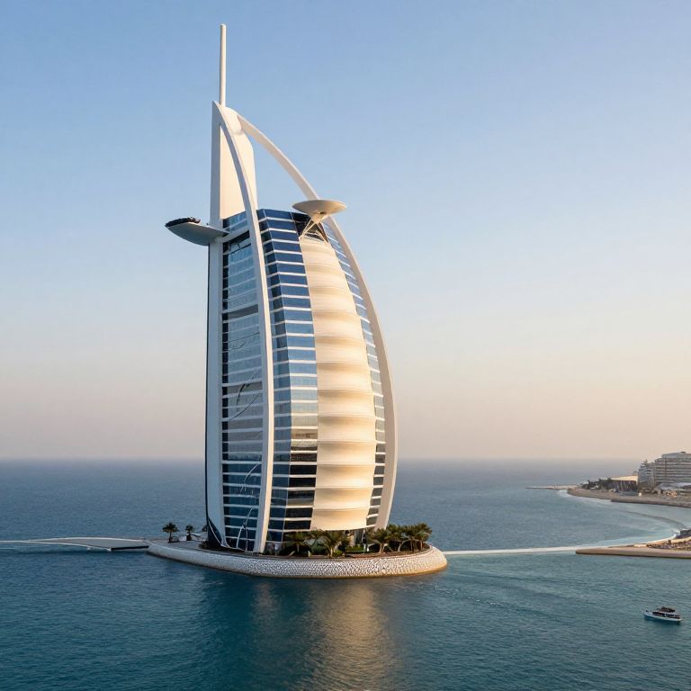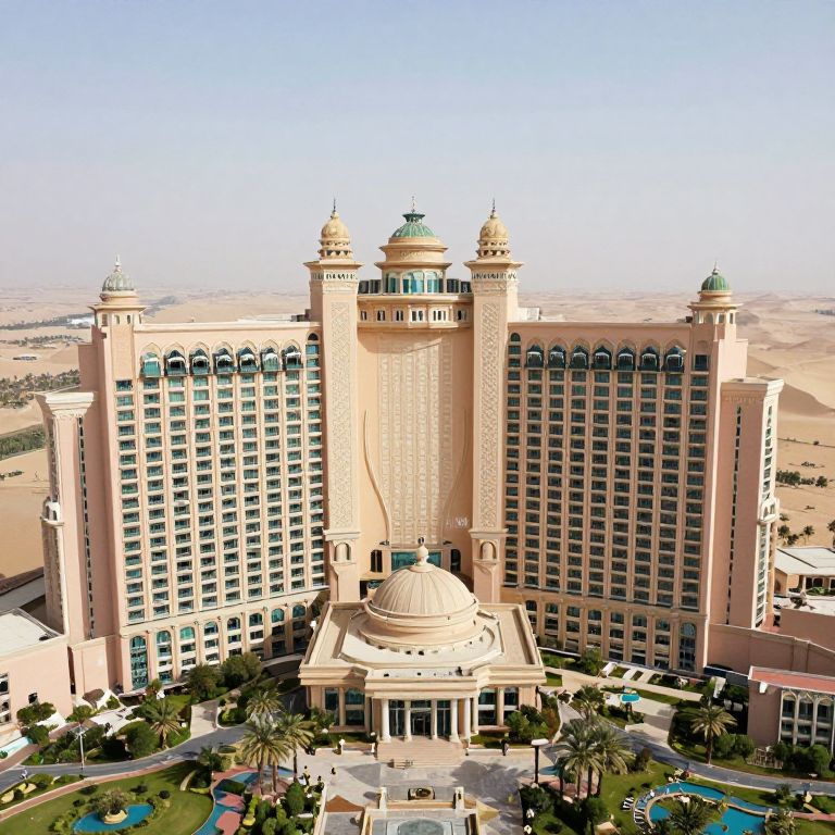 A grand, multi-story hotel building with domed rooftops and intricate architectural details, set against a desert backdrop, viewed from above.