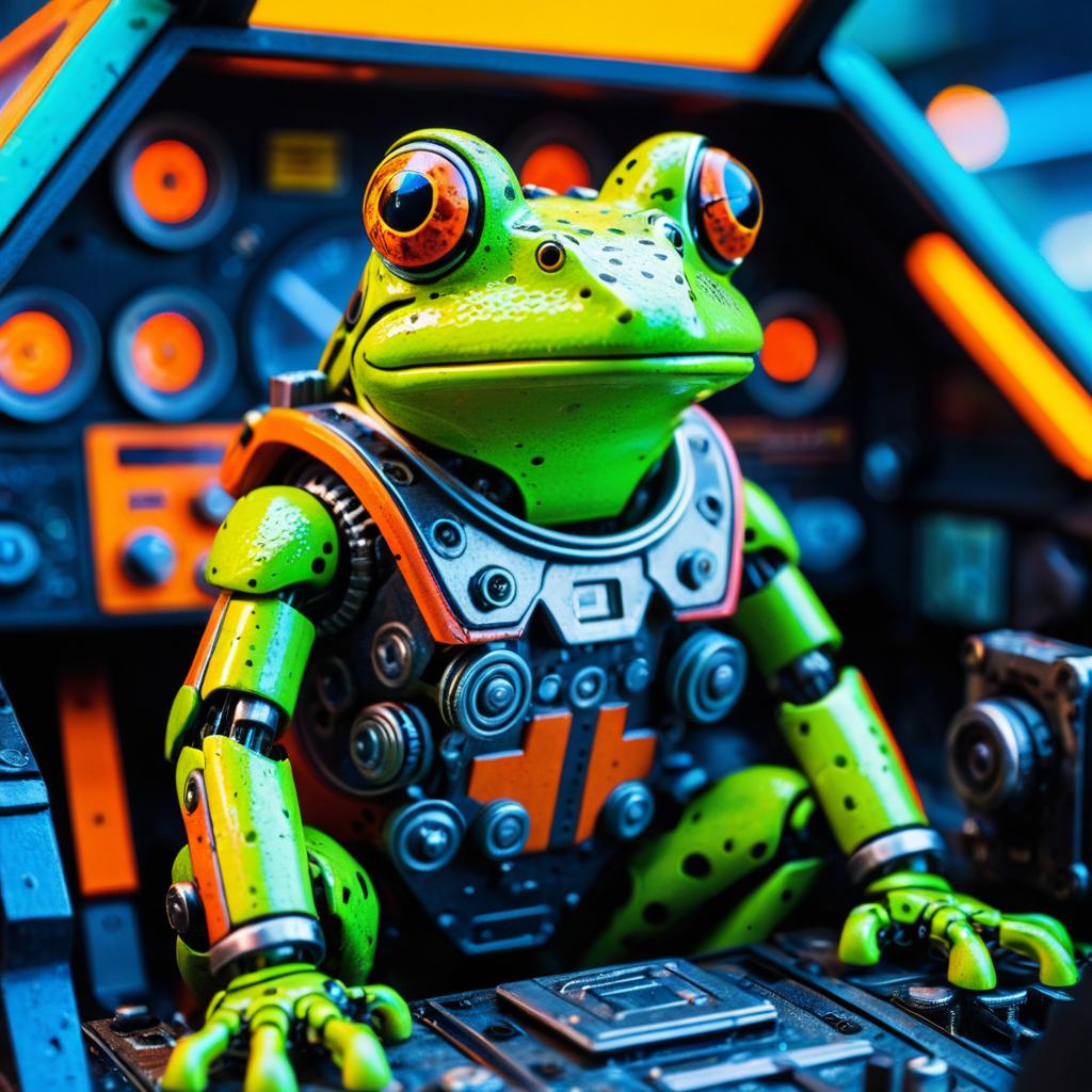 Close-up of a vibrant robotic frog toy with bright neon green, orange, and blue colors seated inside a detailed mechanical cockpit. The frog features realistic plastic textures and articulated mechanical parts, set against a blurred background with futuristic controls and dials, creating a saturated, pop art-inspired atmosphere.