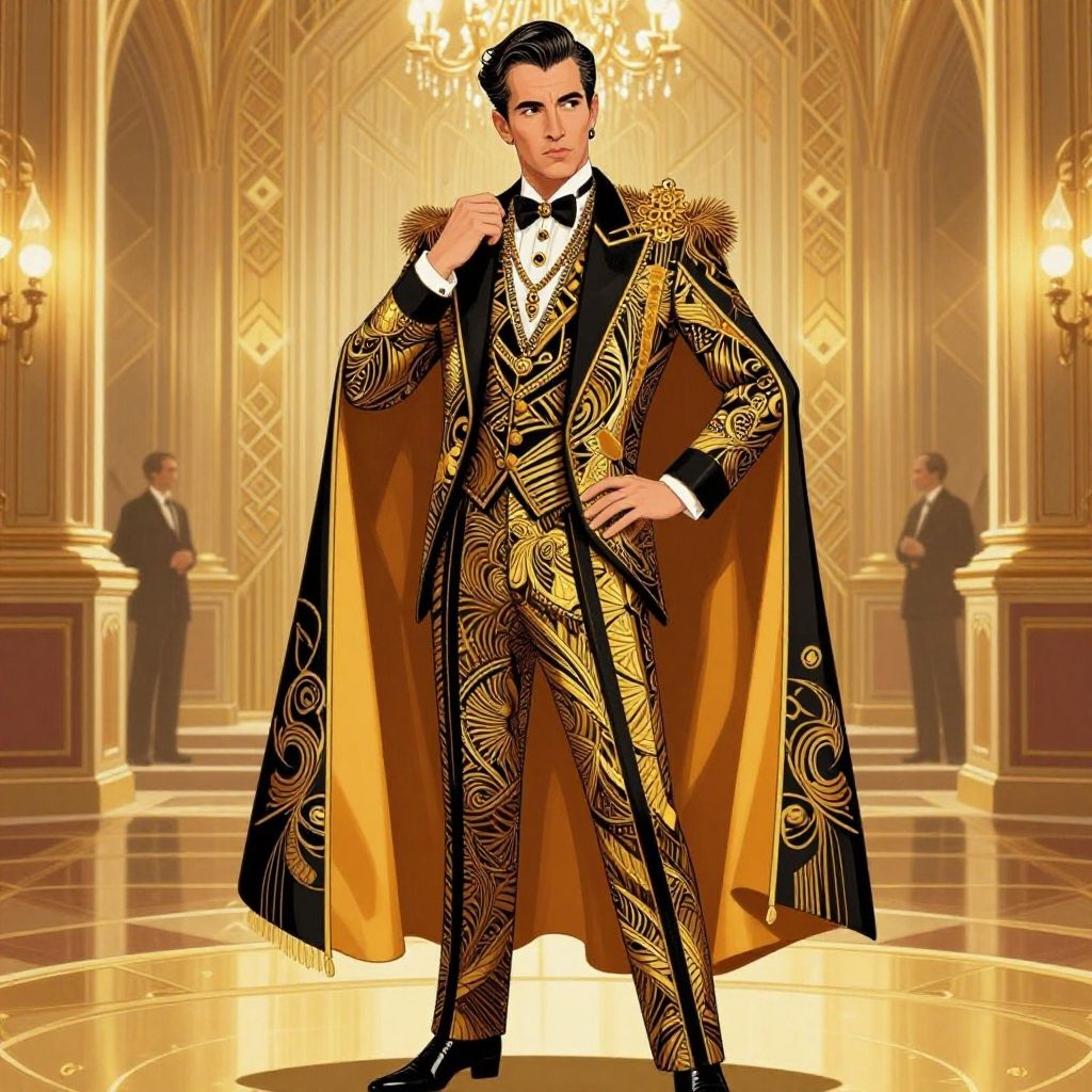 Digital artwork of a confident man in an ornate, gold and black patterned tuxedo and cape, standing in an opulent, golden-h