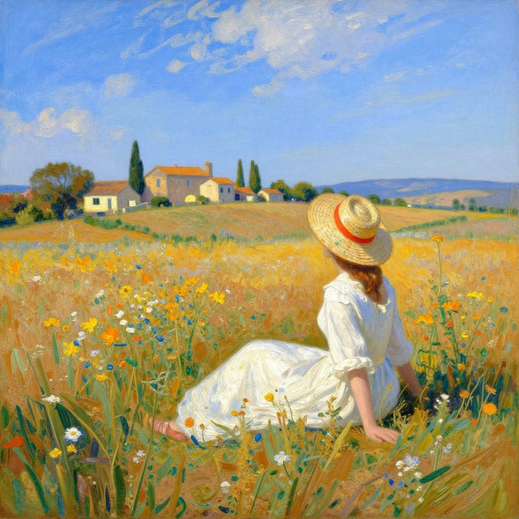 Impressionist-style painting of a woman in a white dress and straw hat, sitting in a sunlit meadow with wildflowers, gazing at