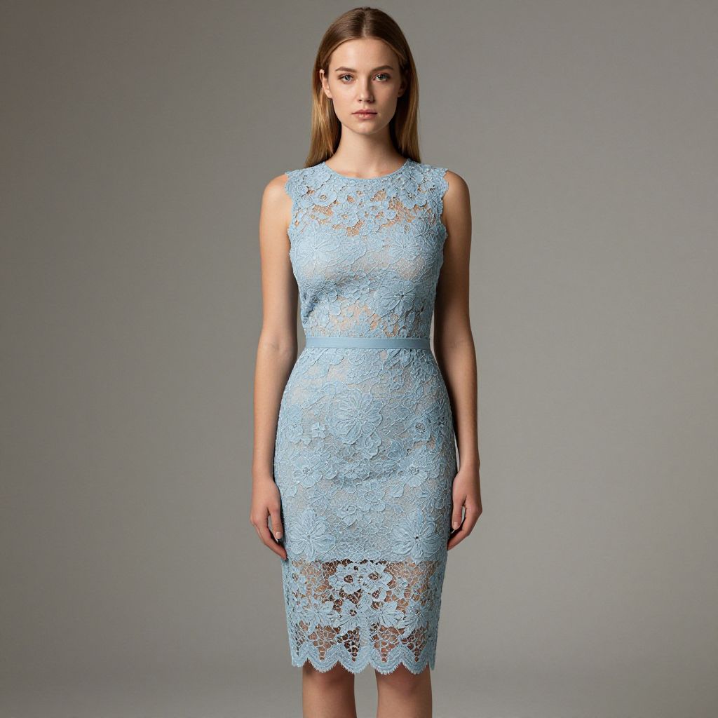 "Woman, modern elegance, sleeveless lace dress in pale blue, intricate floral lace overlay, fitted bodice, round neckline, scalloped hem, knee-length skirt, neutral-toned slip underneath, simple straight blonde hair, minimalist studio background with soft shadow play.. Sexy. Pretty face and beаutiful eyes. Big breasts."