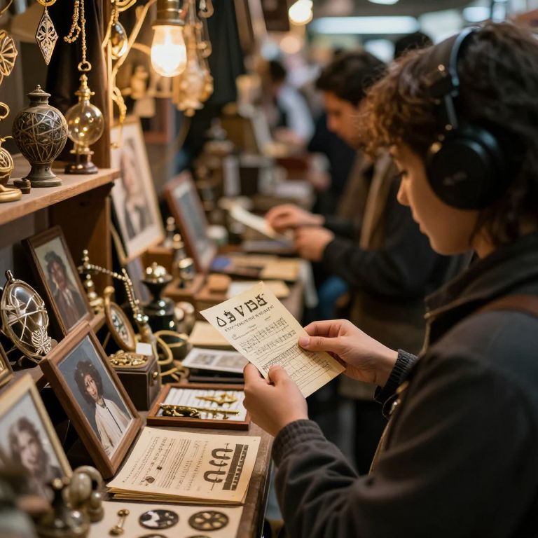 Photograph of a person with curly brown hair, wearing a black hoodie and headphones, examining a brochure titled "SALE" in a dimly lit vintage shop. The person is positioned on the right, standing at a wooden display table filled with antique items, including framed photos, ornate metalwork, and glass objects. The background is blurred, featuring other shoppers and shelves with various trinkets. Warm, yellow lighting from a hanging lamp adds a nostalgic ambiance. The image has a shallow depth of field, emphasizing the person and the table while blurring the background.