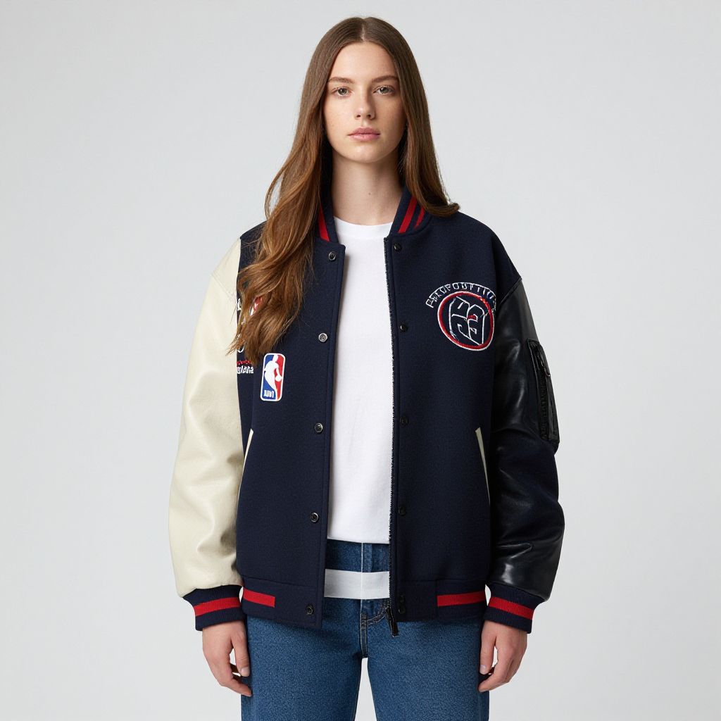 Photograph of a young woman with long, straight brown hair and fair skin standing against a plain white background. She wears a navy blue varsity jacket with red and white stripes on the cuffs and collar, featuring a white left sleeve and a red, white, and blue emblem on the right chest. Underneath, she has a plain white t-shirt and blue jeans. Her expression is neutral, and she stands with her arms slightly relaxed at her sides. The image is brightly lit, emphasizing the clean, minimalistic style.