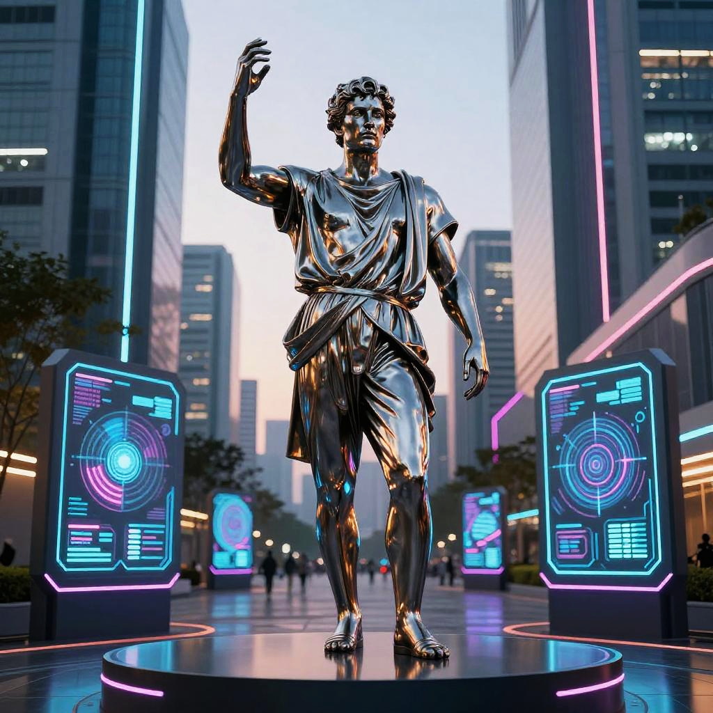 Stoic statue depicted in a futuristic city plaza, sleek metallic finish reflecting neon lights, surrounded by holographic displays and cyberpunk architecture, dusk setting