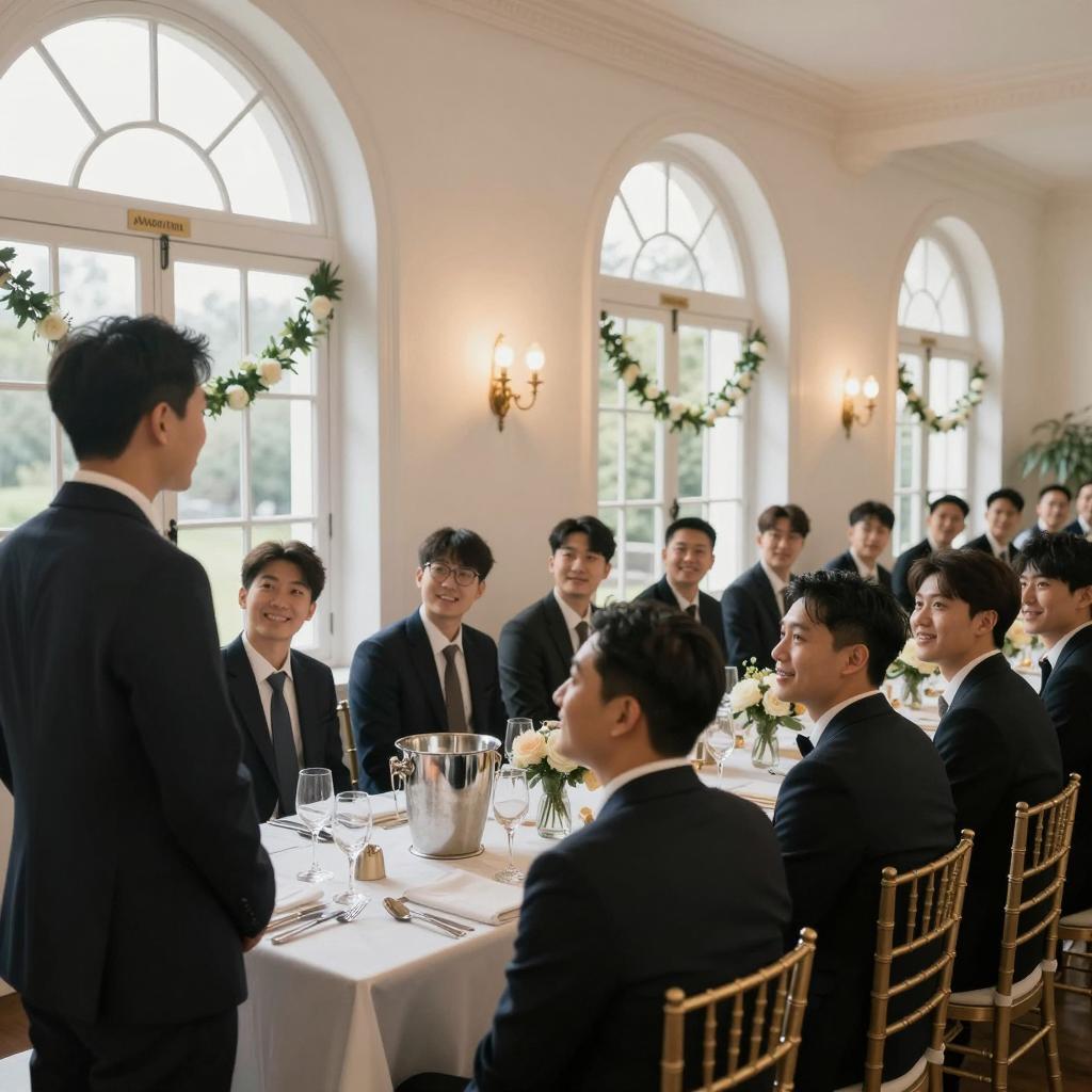 Seventeen men dressed in dark formal suits seated around a long white table at an elegant indoor dinner party. One man stands speaking to the group, who are smiling and attentively looking at him. The room features large arched windows decorated with floral garlands, soft wall sconces, and gold chairs. The table is set with glassware, silverware, white napkins, floral centerpieces, and a silver ice bucket.