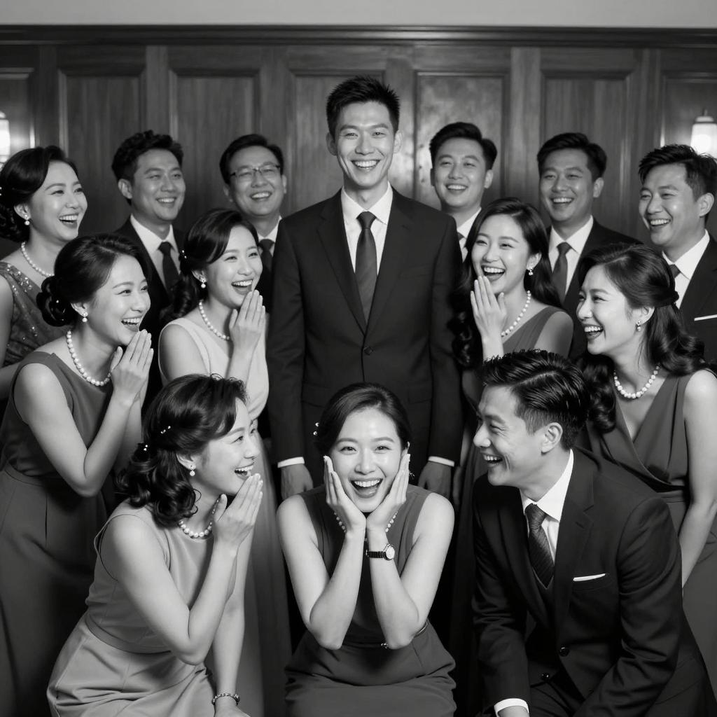 A formal dinner party with 17 men seated at a long table. Man on left stands, facing guests, wearing dark suit and tie. Guests in dark suits, formal attire, seated closely, smiling, looking at him. Floral garland decorates windows in the background. Silver ice bucket and glassware on the table. Large arched windows on the left side. Names on a sign above window.