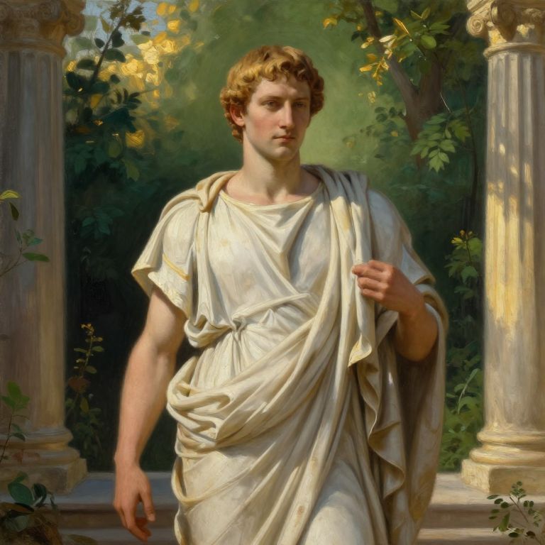 This is a digital painting of a young, Caucasian man with curly, blond hair and fair skin, standing in a classical-style garden. He is dressed in a flowing, white toga with a draped shawl over his shoulder, suggesting ancient Roman or Greek attire. His right hand holds the shawl, while his left arm rests by his side. The background features tall, stone columns with lush greenery and yellow flowers in the distance, bathed in soft, natural light. The painting's realistic style emphasizes the man's muscular build and calm, confident expression. The artist uses smooth, detailed brushstrokes to capture the texture of the fabric and the serene, classical setting.