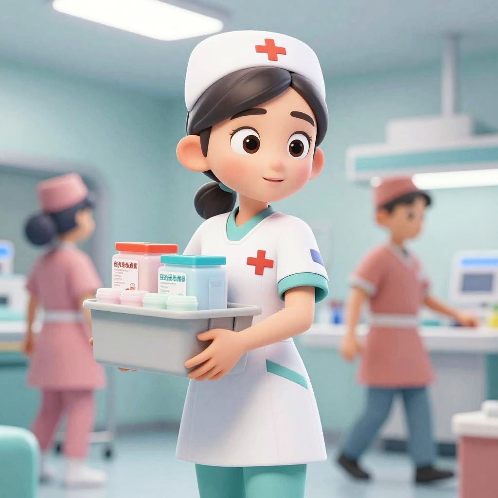 Enfermera in animated style, bright pastel colors, carrying medical supplies in a busy emergency room, dynamic composition with motion blur, expressive facial features showing empathy and professionalism, soft lighting and modern background