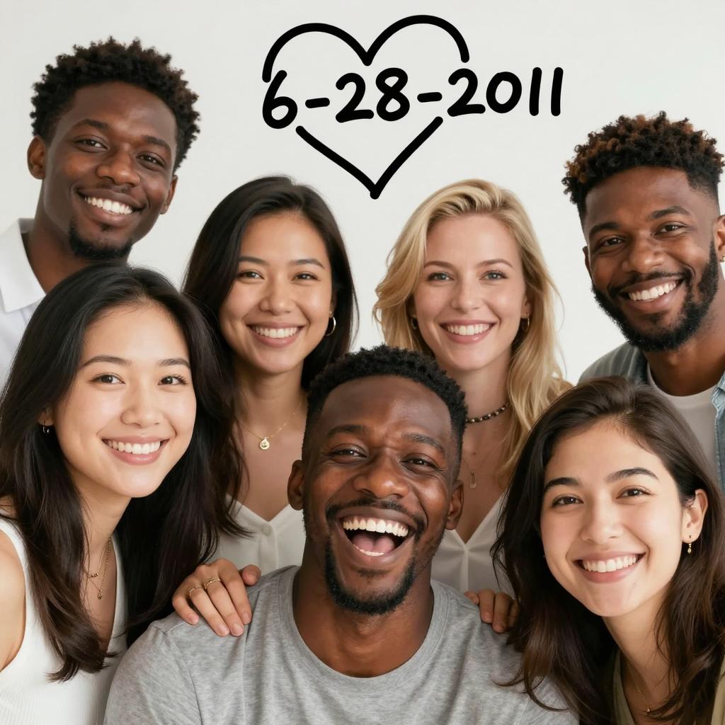 Photograph of a group of seven people. Diverse group, mixed genders, close interactions. Smiling faces, casual clothing. Black man in front, laughing, dark skin. Asian woman, dark hair, smiling. White woman with blonde hair, white top, choker necklace. Black man with short curly hair, white shirt. Close-ups of group, intense smiles. Heart outline and date "6-28-2011" in black ink on white background.