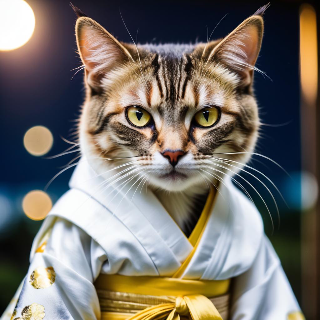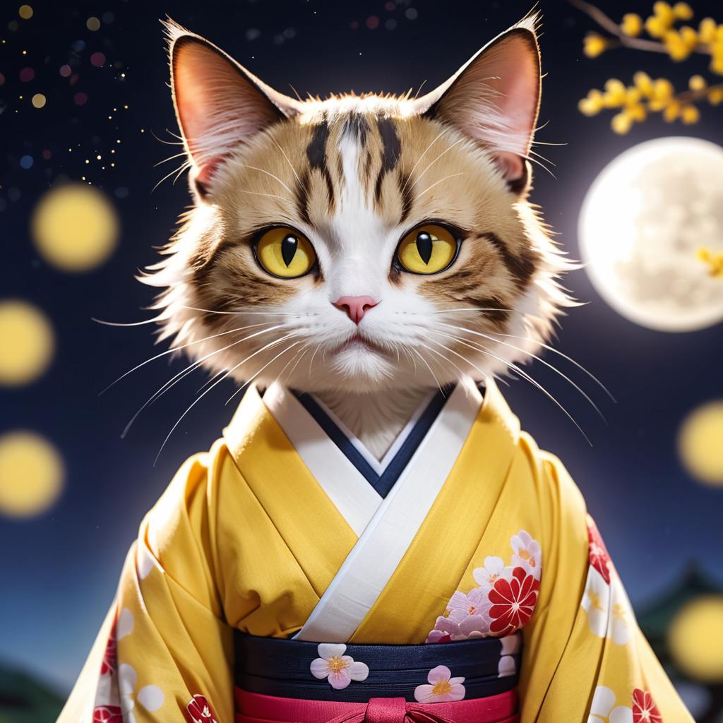 Close-up of a domestic cat wearing a traditional Japanese kimono with floral patterns, featuring a sash (obi) tied around its waist. The cat has striking yellow eyes with slit pupils and a white muzzle, shown from the upper body against a nighttime backdrop with a bright moon and blurred bokeh lights. The kimono is primarily yellow with red, pink, and white flower motifs, and the scene evokes a calm and serene atmosphere.
