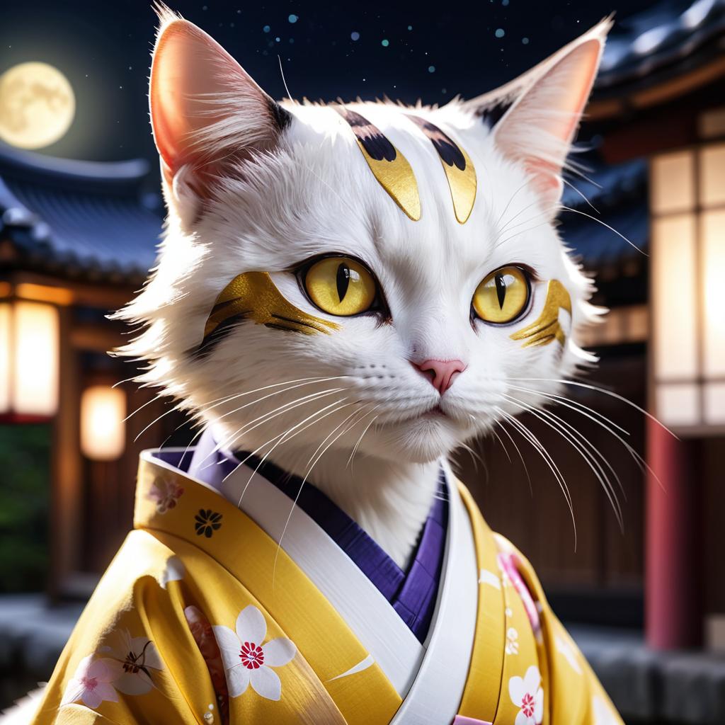 Whiskers, cat, looking at viewer, animal focus, animal, blurry, upper body, japanese clothes, solo, depth of field, moon, no humans, kimono, sash, blurry background, colored sclera, slit pupils, clothed animal, white kimono, closed mouth, long sleeves, yellow sclera, straight-on, obi, bokeh