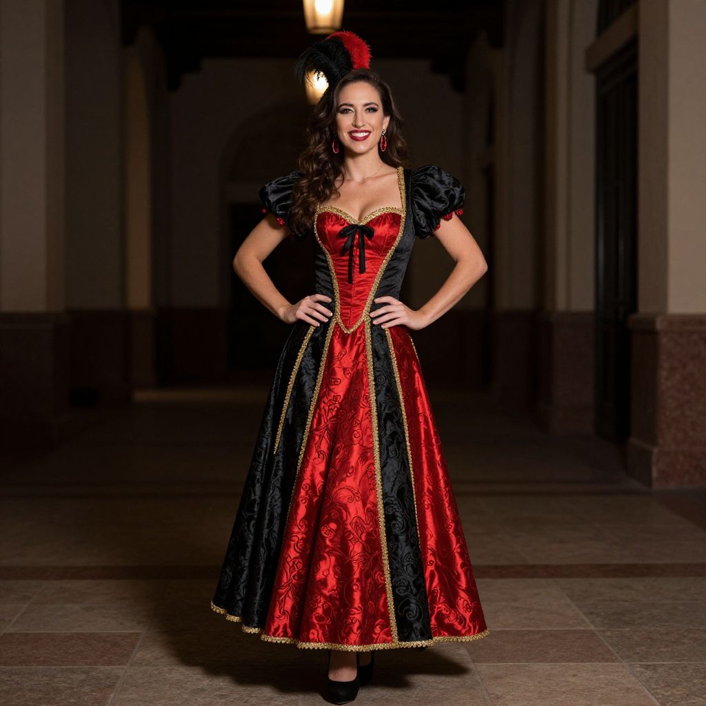 Fancy dress spanish theme, woman in a red and black dress with a gold trim