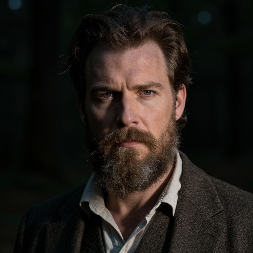 Intimate portrait, soft focus, warm lighting from Edison bulbs, rustic wooden backdrop, man's rugged hands cradling massive carp fish, worn fishing hat, wispy beard, weathered flannel shirt, vintage charm, nostalgic ambiance, rich textures, earthy tones, captivating gaze. Man has masculine face and piercing eyes