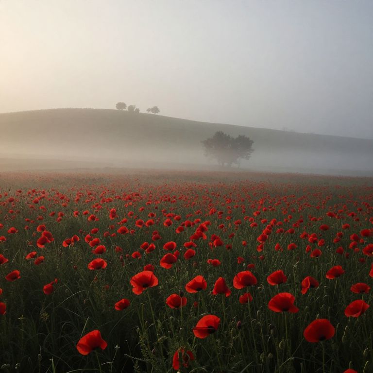 A melancholic foggy morning in a vast field of red poppies, with mist blanketing the landscape, The scene is a wide-angle landscape shot, featuring distant rolling hills and faint silhouettes of trees emerging from the fog, The mood is somber and reflective, with muted, soft lighting as the fog diffuses the morning light, The red poppies create a striking contrast against the subdued, misty background, Photorealistic, natural lighting, 16K resolution