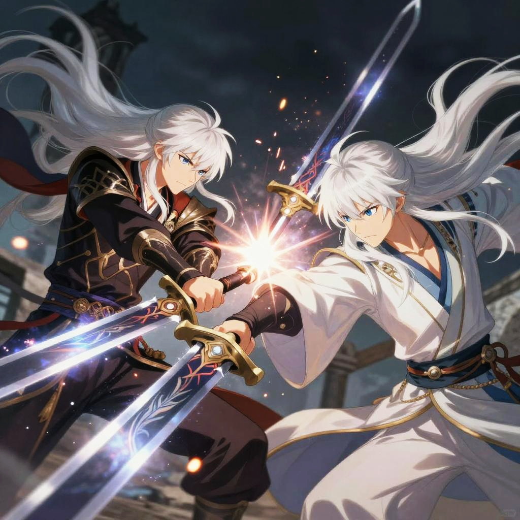 Long white hair anime characters engaged in an epic battle scene, mystical swords clashing with sparks flying, detailed armor and flowing hair moving dynamically, intense facial expressions, dramatic smoky background with vibrant magical effects, cinematic anime style