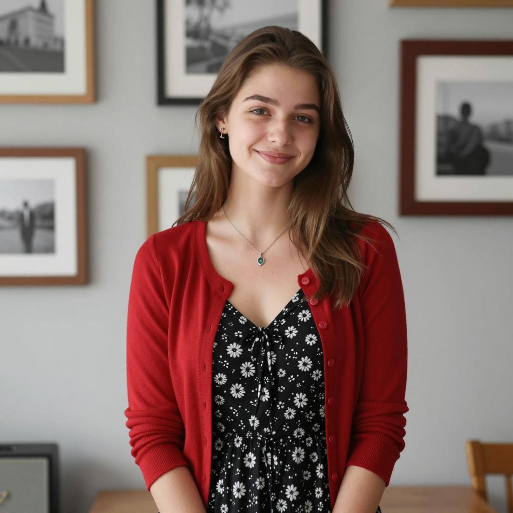 Young woman with fair skin and dark hair, smiling broadly. Wearing a gray knitted sweater and red pants, sitting on a beige couch. Knees are pulled up to chest. Dark background. Natural lighting. Casual attire. Face centered. Upper body visible.