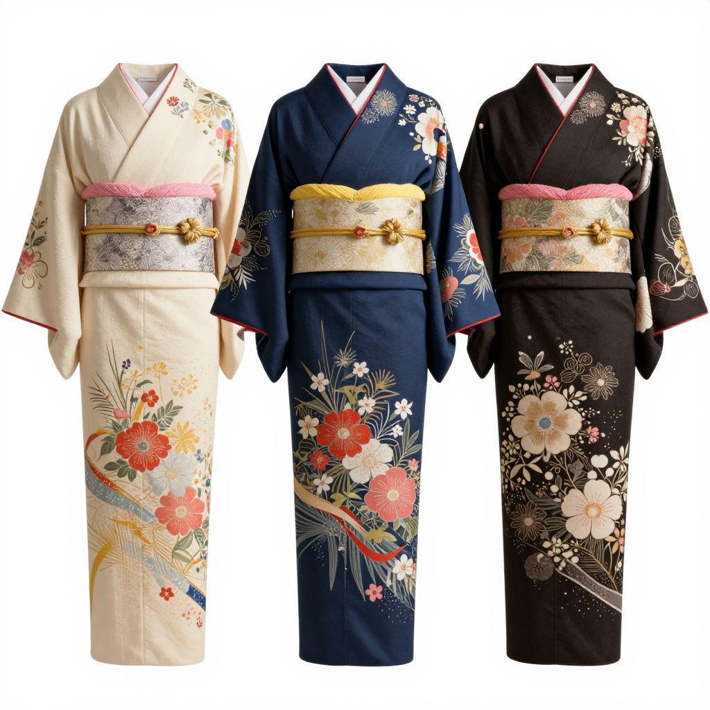 A high-definition digital rendering showcases three elegantly styled Japanese kimonos, each featuring vibrant floral patterns and contrasting colors, with meticulous attention to traditional design elements and harmonious color palettes.