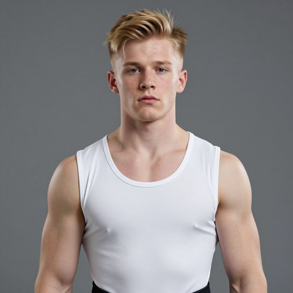 Weightlifting costume, solo, 1boy, male focus, realistic, blonde hair, shirt, sleeveless, looking at viewer, upper body, white shirt, sleeveless shirt, closed mouth, grey background