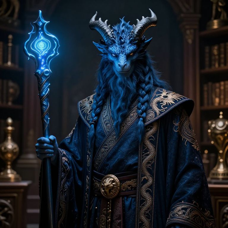 Dragonborn portrait featuring a wise dragonborn sage with deep blue scales, braided horns, mystical tattoos, holding a glowing staff, dressed in ancient robes embroidered with dragons, set in a mystical library filled with arcane artifacts, fantasy realism.