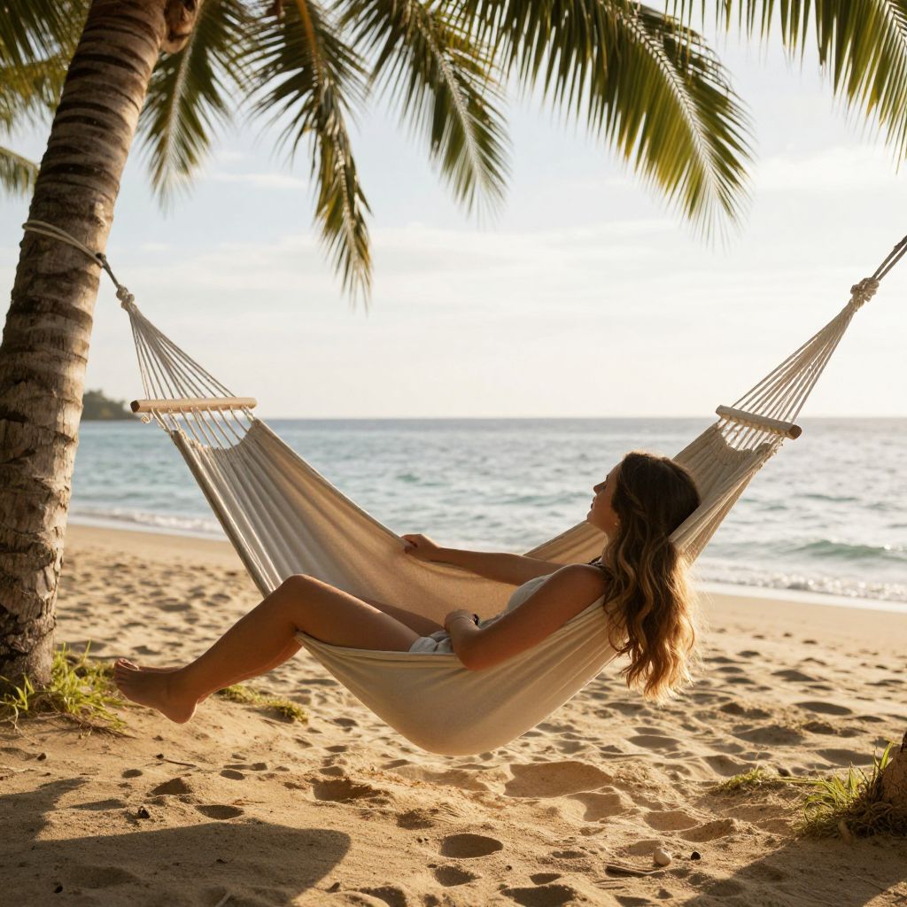 Embracing the serenity of a tropical paradise, a woman reclines in a hammock, her form bathed in the warm embrace of sunlight, evoking a profound sense of freedom and timeless peace.