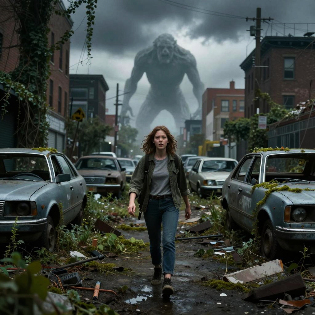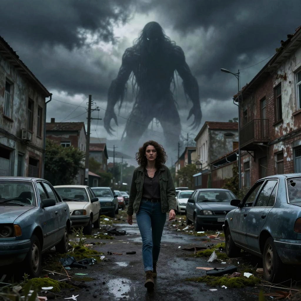 Photograph-style digital art of a creepy urban scene. A curly-haired woman in a green jacket and blue jeans walks down a deserted, overgrown street littered with broken cars. In the background, a giant, menacing, shadowy creature looms under a stormy, cloudy sky. The buildings on either side are dilapidated, adding to the eerie atmosphere. The ground is wet and covered in moss.