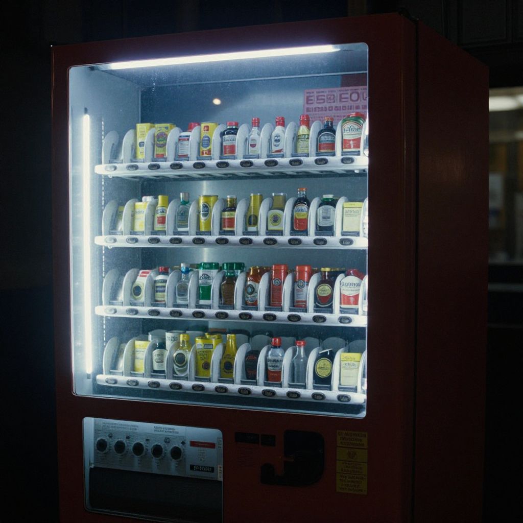 Photograph of a brightly lit vending machine displaying five shelves of variously colored cleaning product bottles, illuminated against a dark background.