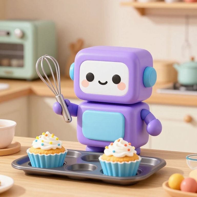 Cute robot design baking cupcakes in a retro kitchen, rounded shapes and pastel purple and blue colors, holding a whisk in one hand and smiling brightly, whimsical and cozy atmosphere with vintage appliances and warm textures