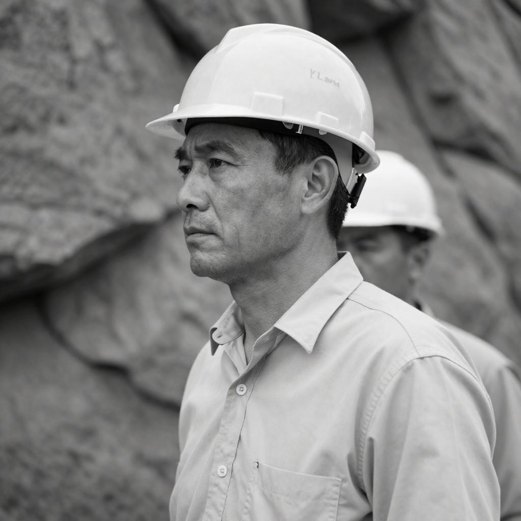 Black-and-white photograph of a middle-aged man with medium skin tone, wearing a white hard hat and light-colored button-up shirt, gripping a truck steering wheel. His expression is serious, and the background is blurred, showing indistinct industrial elements. The man's shirt has two chest pockets, and his right hand is prominently visible on the wheel.