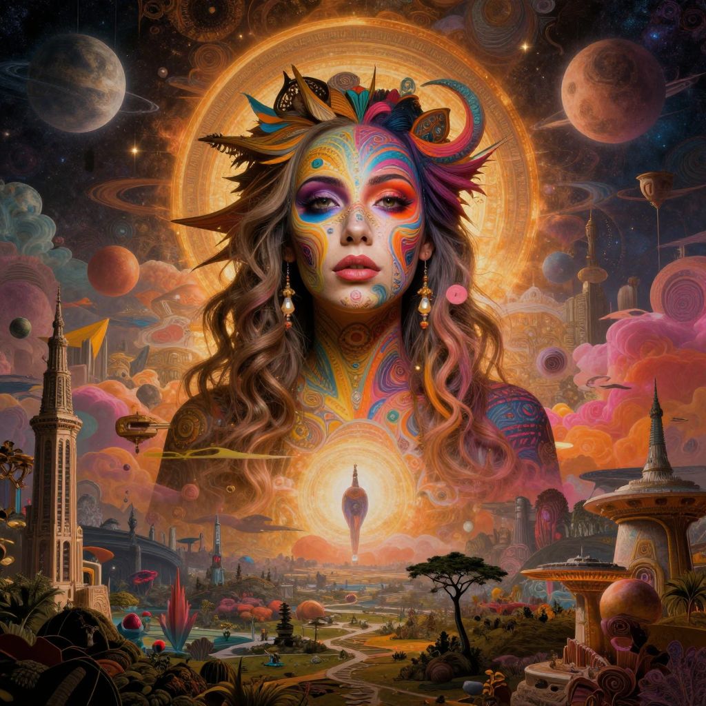 Surreal digital artwork of a colorful, face-painted woman with wild hair, glowing halo, and cosmic background featuring planets, towers, and floating