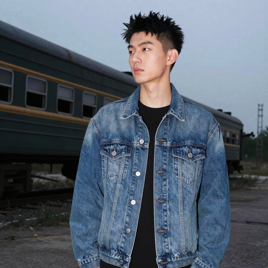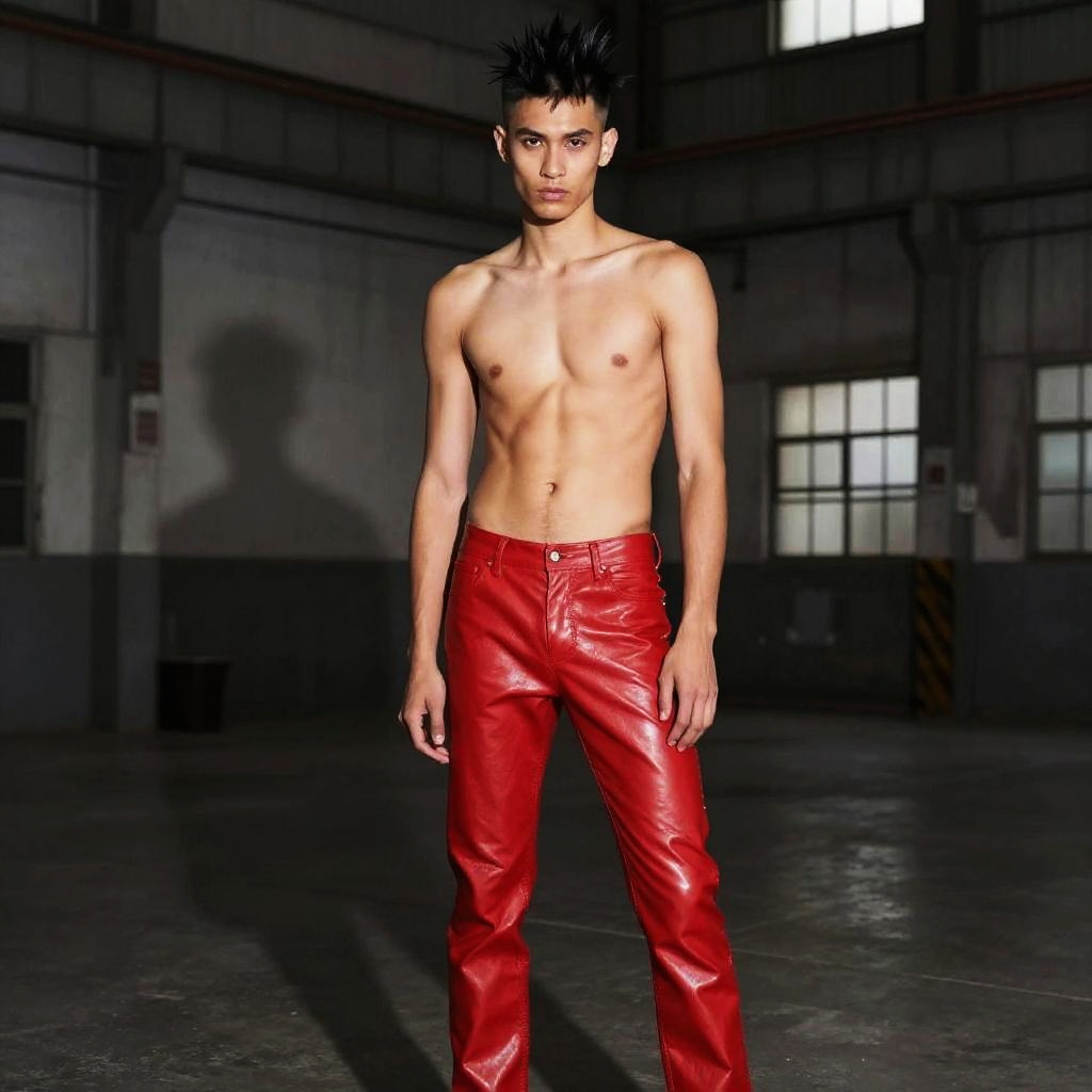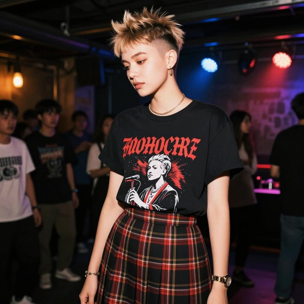 Faux Hawk Fade hairstyle on female punk rocker, wearing studded leather vest, in concert stage, captured in fashion editorial style with colored spotlight.