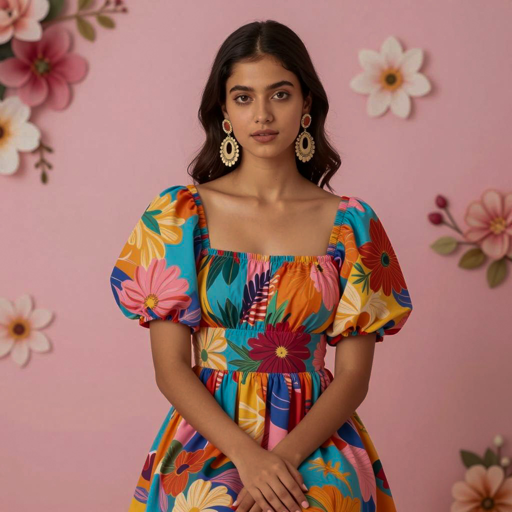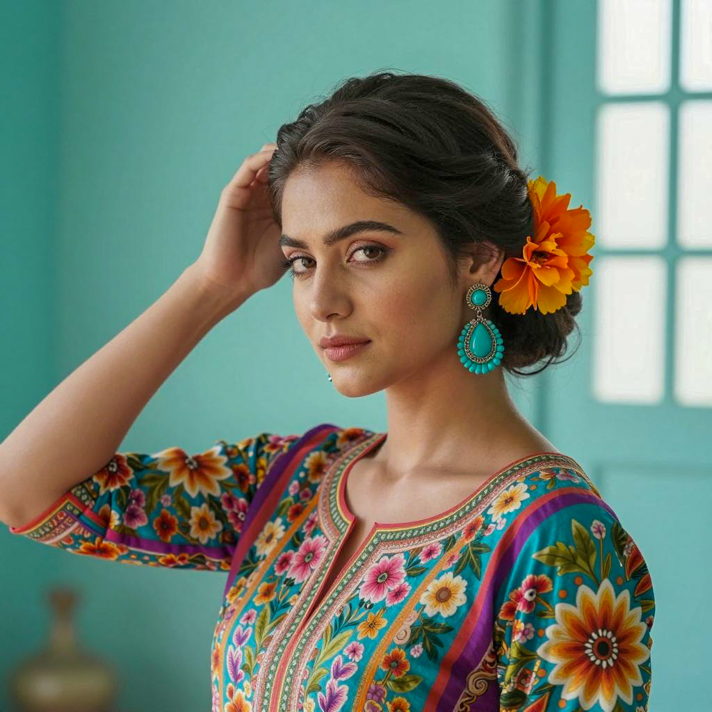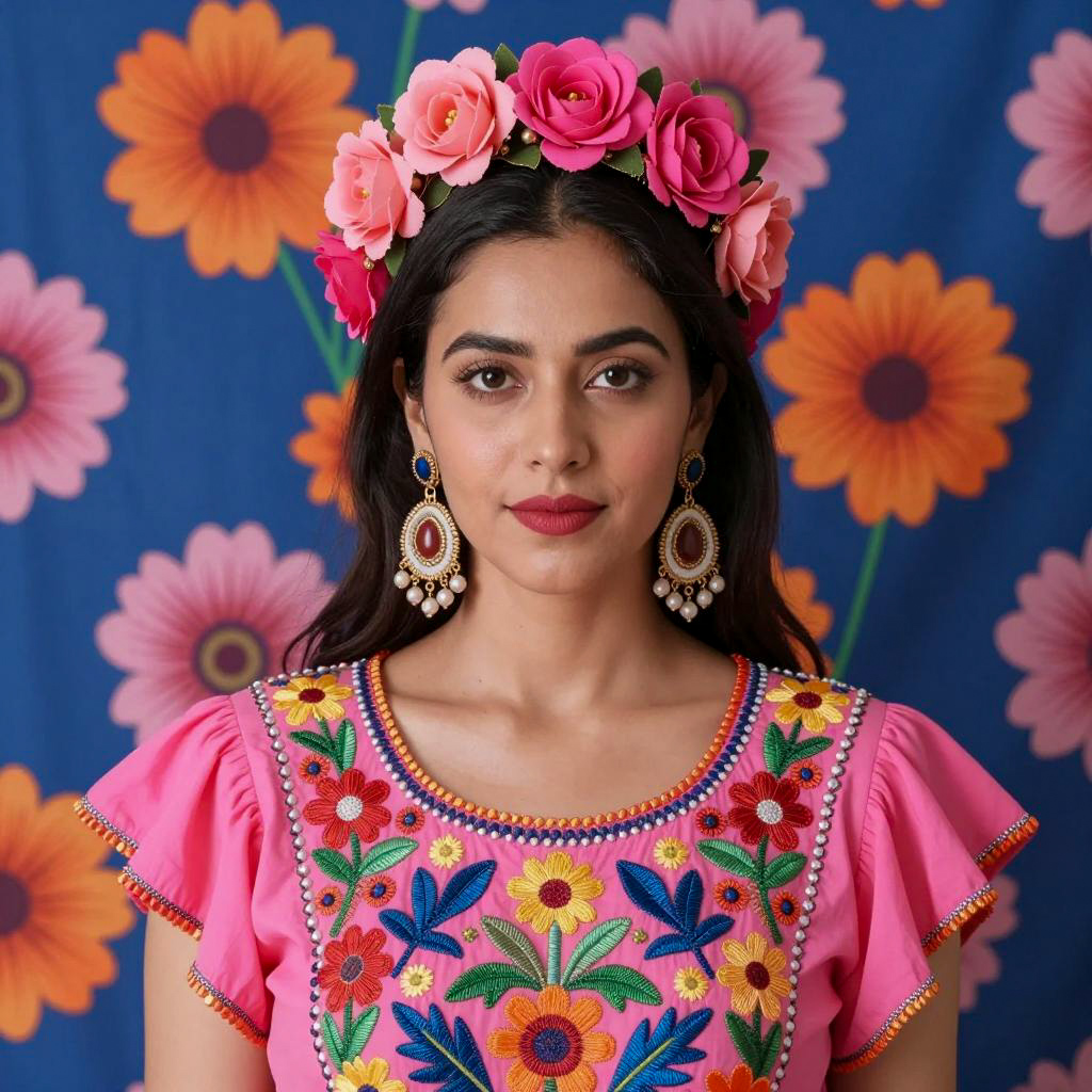 Photograph of a young woman with dark hair in a braid, wearing a yellow dress with colorful floral embroidery. She has round earrings with bright patterns, a red flower in her hair, and a neutral facial expression. Brightly colored floral background. Standing, looking slightly to the side.