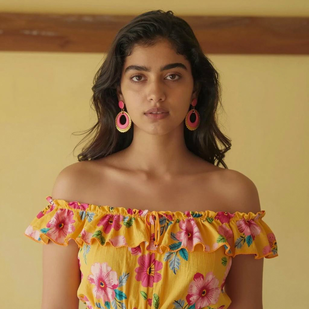 Portrait of a young woman with medium skin tone and dark braided hair, wearing a yellow dress featuring colorful floral embroidery on the chest. She accessorizes with vibrant round earrings, a red flower tucked behind her ear, and stands against a bright floral-patterned background, looking slightly to the side with a neutral expression.