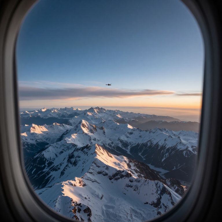 The image presents a breathtaking view from the window of a spacecraft, revealing a stunning landscape of snow-capped mountains stretching into the distance, with a clear horizon visible in the background. The sky is a beautiful gradient of blues and oranges, with a few scattered clouds adding depth to the scene. A small, sleek spacecraft is flying above the mountains, adding a sense of scale and adventure to the image. The curvature of the Earth is visible in the distance, with stars twinkling in the night sky. The overall composition is balanced, with the mountains and the horizon creating a harmonious visual rhythm. The interplay of colors and textures, from the icy whites of the mountains to the warm hues of the sky, creates a sense of tranquility and awe.