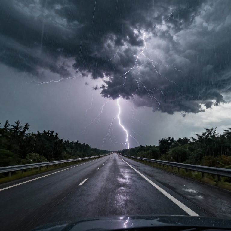 Fresnel Reflection A violent dark rain and thunderstorm on an empty highway from the POV of a car driving it,