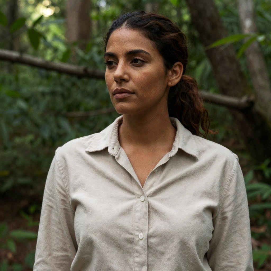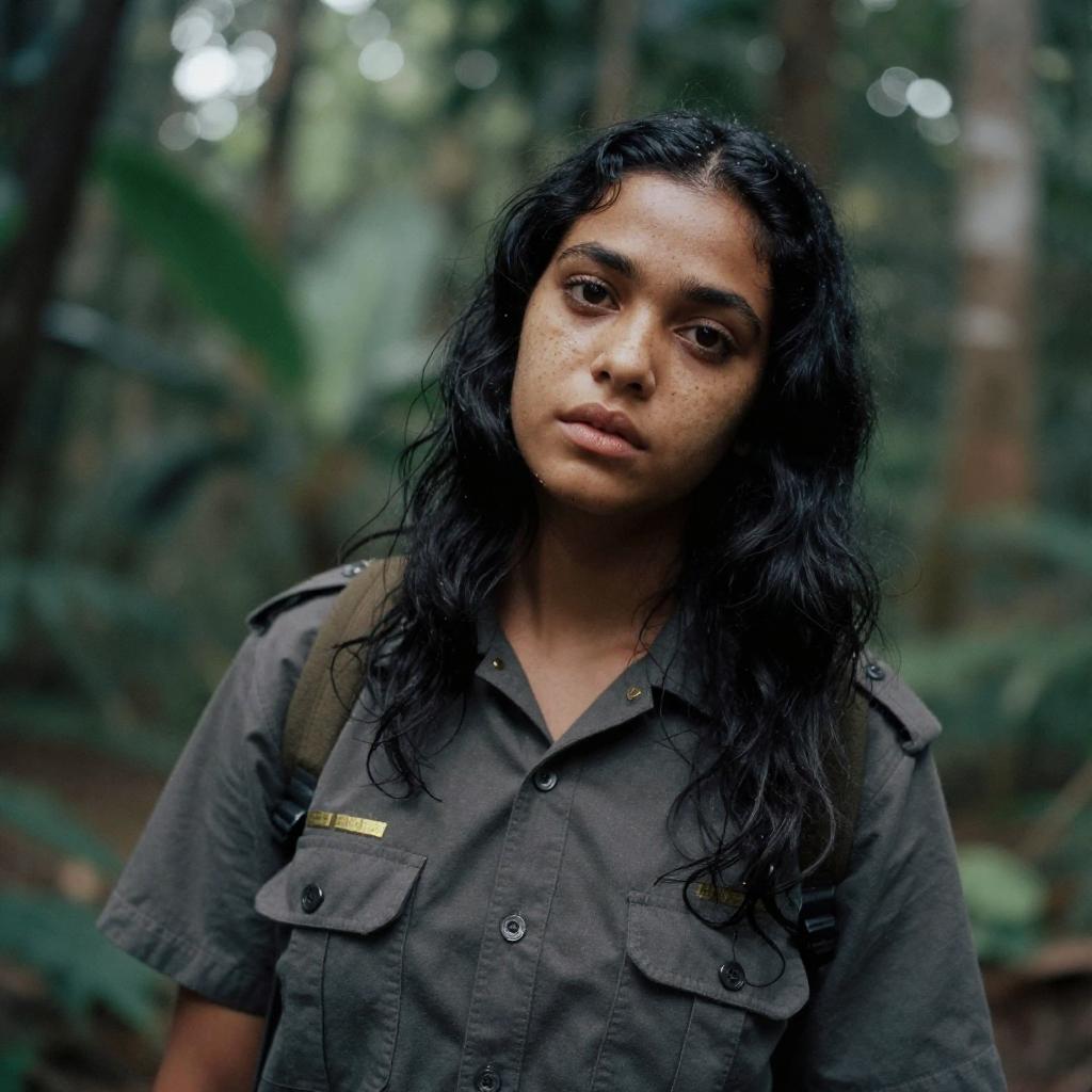 Close-up portrait of a young Malagasy woman with natural black curly hair and freckles wearing a green uniform shirt, standing in a lush forest. The subject has a serious expression, with soft natural lighting and a blurred forest background.