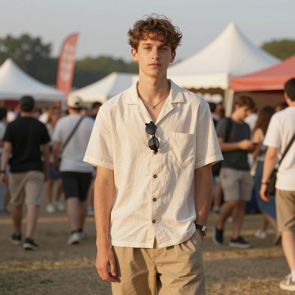 A young man dressed in a casual summer costume stands confidently amidst a lively summer festival crowd. The warm golden hour light highlights his relaxed and approachable demeanor, with tents and festival-goers blurred softly in the background, creating a vibrant and inviting atmosphere.