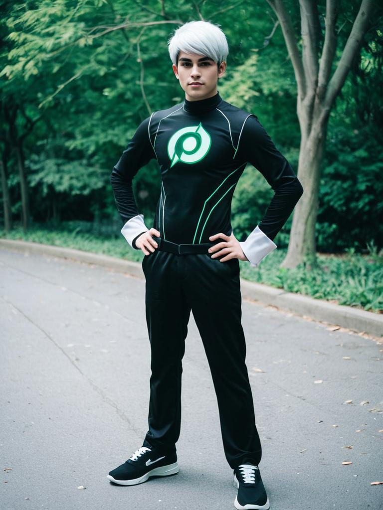 Young adult male dressed in a realistic Danny Phantom cosplay costume, featuring a black and green bodysuit with a stylized 'P' symbol. The model has striking white hair and is standing on a sidewalk surrounded by greenery, portraying a confident pose.