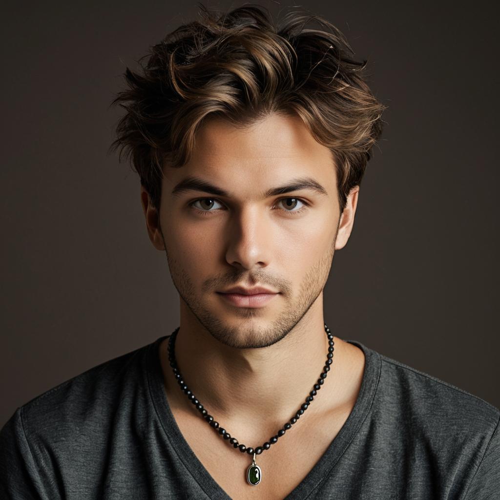 Cutting style gents, photorealistic portrait of a handsome young man, medium-length wavy brown hair with blonde highlights, intense green eyes, fair skin, wearing a black fitted t-shirt, two gold necklaces with pendants, neutral brown background, studio lighting, slightly messy hair, serious expression, head and shoulders, realistic ure, high detail, photorealism, T2I, stylish, modern, male model