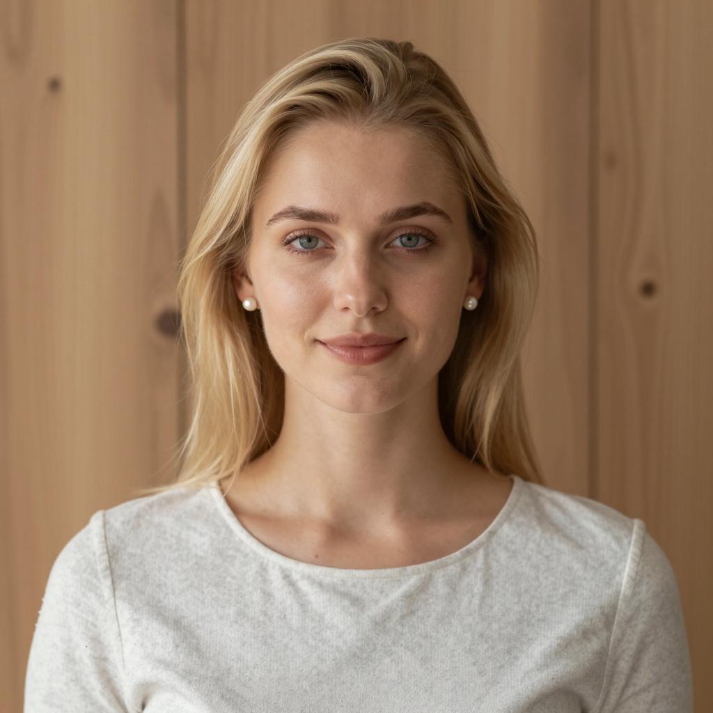 Blonde woman with light skin and slight smile, wearing a grayish-white top, pearl earrings, against a wooden background. Her straight hair is parted in the middle, and she faces the camera directly. Upper body portrait.